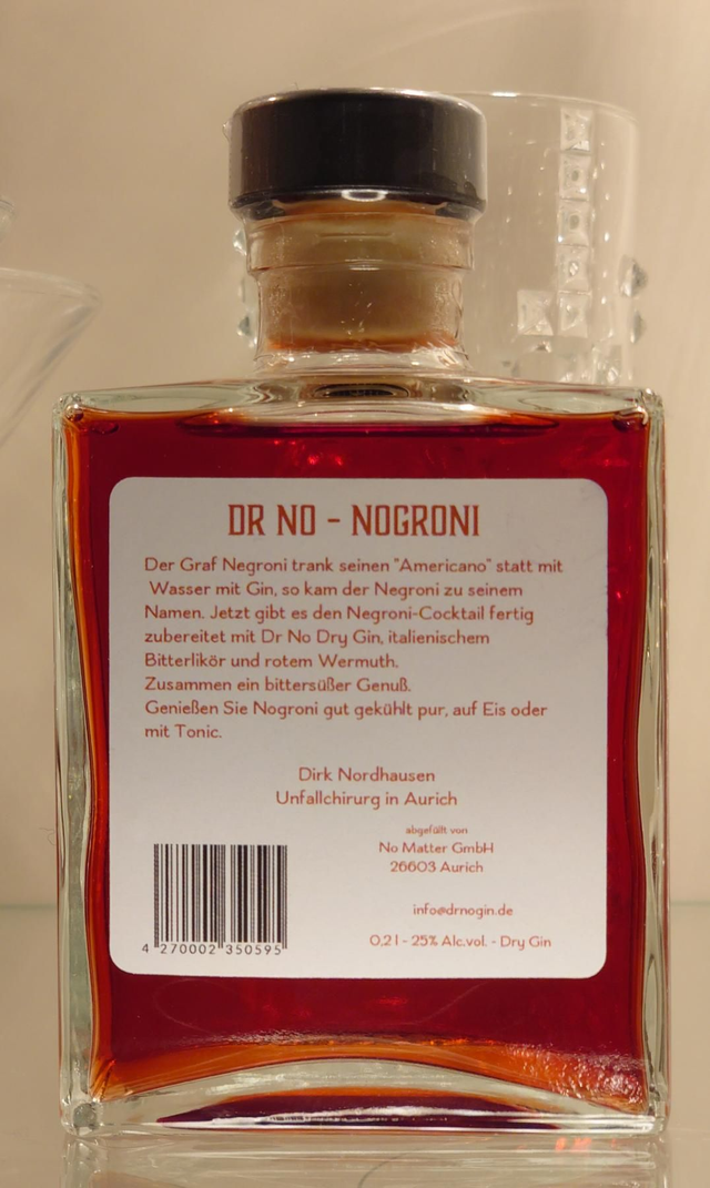 Der Graf Negroni trank seinen "Americano" statt mit Wasser mit Gin, so kam der Negroni zu seinem Namen. Jetzt gibt es den Negroni-Cocktail fertig zubereitet mit Dr No Dry Gin, italienischem Bitterlikör und rotem Wermuth. Zusammen ein bittersüßer Genuß Genießen Sie Nogroni gut gekühlt pur, auf Eis oder mit Tonic.